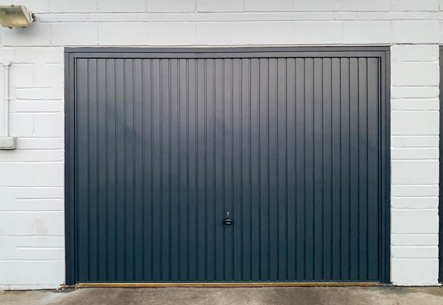 A row of 4x Garador Carlton Vertically Ribbed Canopy Up & Over Garage Doors Finished in Anthracite Grey, Installed in Southend by our Upminster Branch.