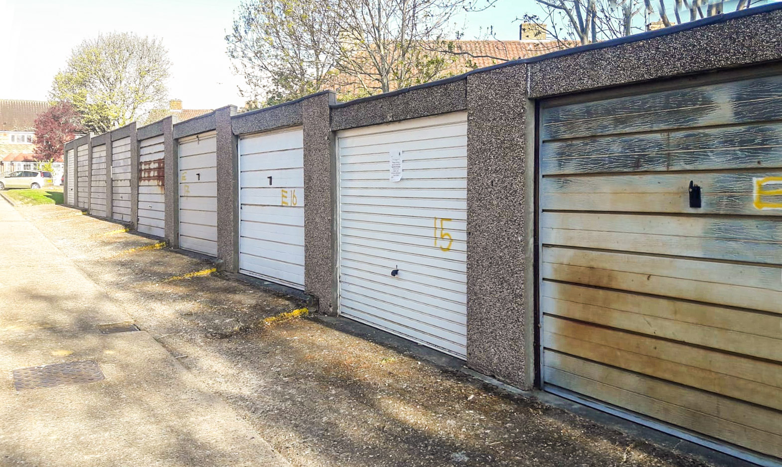 The image below shows the row of garages before the new garage door installations >